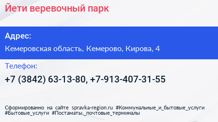 Йети, веревочный парк по адресу Кемеровская область, Кемерово, Кирова, 4 в дальнейшем Организация, размещена в следующих категориях: