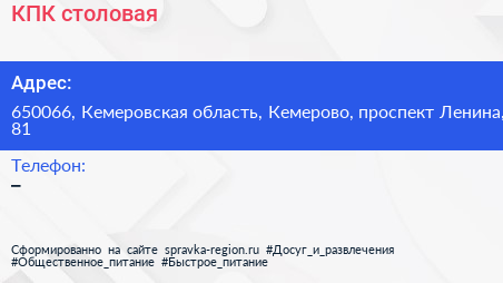КПК, столовая по адресу 650066, Кемеровская область, Кемерово, проспект Ленина, 81 в дальнейшем Организация, размещена в следующих категориях: