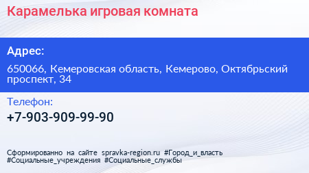 Карамелька, игровая комната по адресу 650066, Кемеровская область, Кемерово, Октябрьский проспект, 34 в дальнейшем Организация, размещена в следующих категориях: