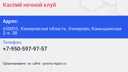Каспий, ночной клуб по адресу 650051, Кемеровская область, Кемерово, Камышинская 2-я, 38 в дальнейшем Организация, размещена в следующих категориях: