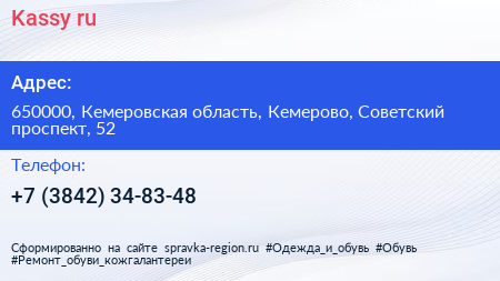 Kassy.ru по адресу 650000, Кемеровская область, Кемерово, Советский проспект, 52 в дальнейшем Организация, размещена в следующих категориях: