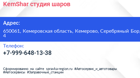 KemShar, студия шаров по адресу 650061, Кемеровская область, Кемерово, Серебряный Бор, 4 в дальнейшем Организация, размещена в следующих категориях: