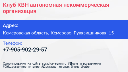 Клуб КВН, автономная некоммерческая организация по адресу Кемеровская область, Кемерово, Рукавишникова, 15 в дальнейшем Организация, размещена в следующих категориях: