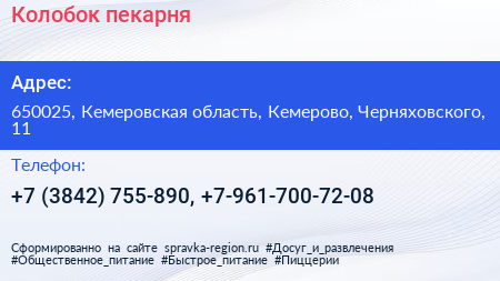 Колобок, пекарня по адресу 650025, Кемеровская область, Кемерово, Черняховского, 11 в дальнейшем Организация, размещена в следующих категориях: