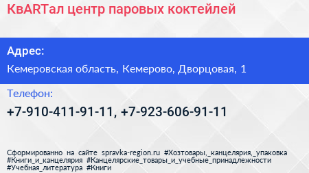 КвARTал, центр паровых коктейлей по адресу Кемеровская область, Кемерово, Дворцовая, 1 в дальнейшем Организация, размещена в следующих категориях: