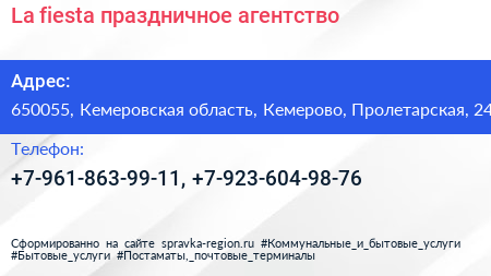 La fiesta, праздничное агентство по адресу 650055, Кемеровская область, Кемерово, Пролетарская, 24 в дальнейшем Организация, размещена в следующих категориях: