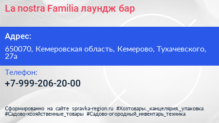 La nostra Familia, лаундж-бар по адресу 650070, Кемеровская область, Кемерово, Тухачевского, 27а в дальнейшем Организация, размещена в следующих категориях: