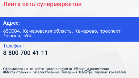 Лента, сеть супермаркетов по адресу 650004, Кемеровская область, Кемерово, проспект Ленина, 59а в дальнейшем Организация, размещена в следующих категориях: