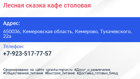 Лесная сказка, кафе-столовая по адресу 650036, Кемеровская область, Кемерово, Тухачевского, 22а в дальнейшем Организация, размещена в следующих категориях:
