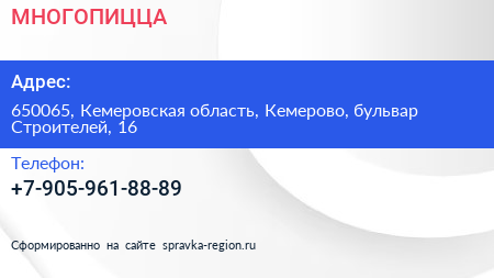#МНОГОПИЦЦА по адресу 650065, Кемеровская область, Кемерово, бульвар Строителей, 16 в дальнейшем Организация, размещена в следующих категориях: