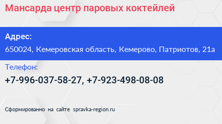 Мансарда, центр паровых коктейлей по адресу 650024, Кемеровская область, Кемерово, Патриотов, 21а в дальнейшем Организация, размещена в следующих категориях:
