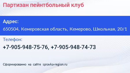 Партизан, пейнтбольный клуб по адресу 650504, Кемеровская область, Кемерово, Школьная, 20/1 в дальнейшем Организация, размещена в следующих категориях: