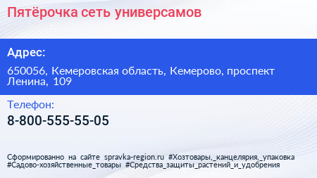 Пятёрочка, сеть универсамов по адресу 650056, Кемеровская область, Кемерово, проспект Ленина, 109 в дальнейшем Организация, размещена в следующих категориях: