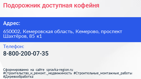 Подорожник, доступная кофейня по адресу 650002, Кемеровская область, Кемерово, проспект Шахтёров, 85 к1 в дальнейшем Организация, размещена в следующих категориях:
