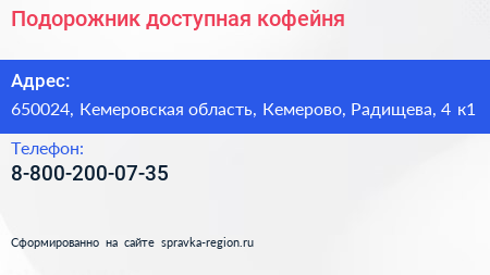 Подорожник, доступная кофейня по адресу 650024, Кемеровская область, Кемерово, Радищева, 4 к1 в дальнейшем Организация, размещена в следующих категориях: