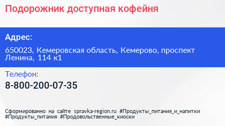 Подорожник, доступная кофейня по адресу 650023, Кемеровская область, Кемерово, проспект Ленина, 114 к1 в дальнейшем Организация, размещена в следующих категориях: