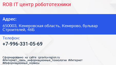 ROB IT, центр робототехники по адресу 650003, Кемеровская область, Кемерово, бульвар Строителей, 46Б в дальнейшем Организация, размещена в следующих категориях: