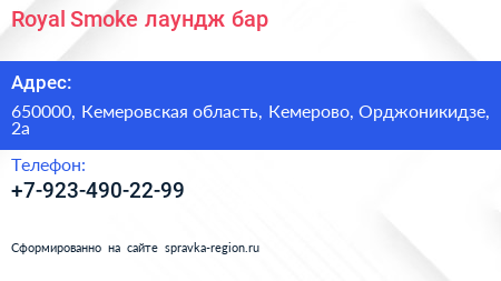 Royal Smoke, лаундж-бар по адресу 650000, Кемеровская область, Кемерово, Орджоникидзе, 2а в дальнейшем Организация, размещена в следующих категориях: