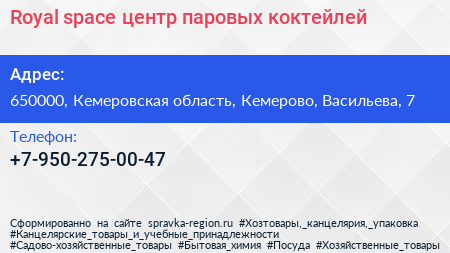 Royal space, центр паровых коктейлей по адресу 650000, Кемеровская область, Кемерово, Васильева, 7 в дальнейшем Организация, размещена в следующих категориях: