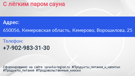 С лёгким паром, сауна по адресу 650056, Кемеровская область, Кемерово, Ворошилова, 25 в дальнейшем Организация, размещена в следующих категориях: