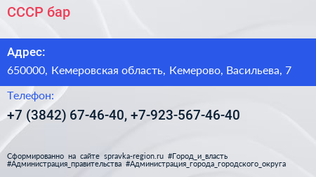 СССР, бар по адресу 650000, Кемеровская область, Кемерово, Васильева, 7 в дальнейшем Организация, размещена в следующих категориях: