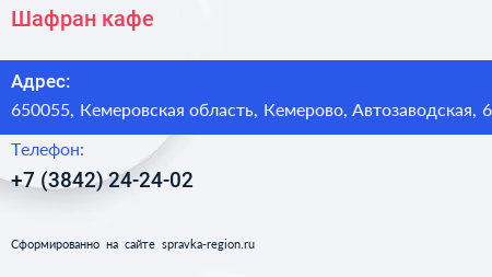 Шафран, кафе по адресу 650055, Кемеровская область, Кемерово, Автозаводская, 6 в дальнейшем Организация, размещена в следующих категориях: