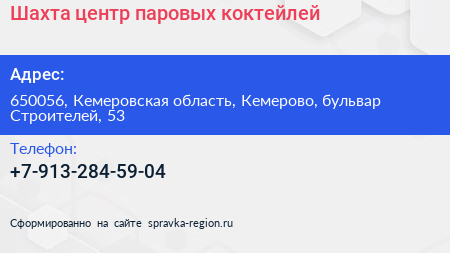 Шахта, центр паровых коктейлей по адресу 650056, Кемеровская область, Кемерово, бульвар Строителей, 53 в дальнейшем Организация, размещена в следующих категориях: