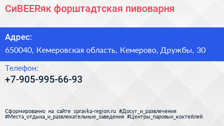 СиBEERяк, форштадтская пивоварня по адресу 650040, Кемеровская область, Кемерово, Дружбы, 30 в дальнейшем Организация, размещена в следующих категориях: