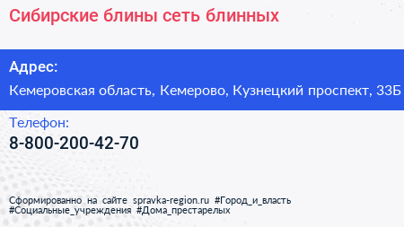 Сибирские блины, сеть блинных по адресу Кемеровская область, Кемерово, Кузнецкий проспект, 33Б в дальнейшем Организация, размещена в следующих категориях: