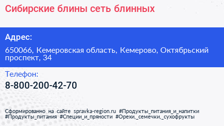 Сибирские блины, сеть блинных по адресу 650066, Кемеровская область, Кемерово, Октябрьский проспект, 34 в дальнейшем Организация, размещена в следующих категориях: