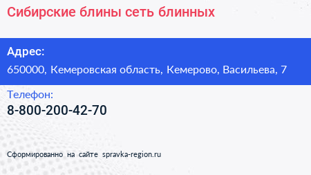 Сибирские блины, сеть блинных по адресу 650000, Кемеровская область, Кемерово, Васильева, 7 в дальнейшем Организация, размещена в следующих категориях: