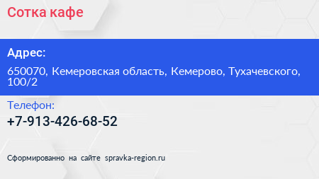 Сотка, кафе по адресу 650070, Кемеровская область, Кемерово, Тухачевского, 100/2 в дальнейшем Организация, размещена в следующих категориях: