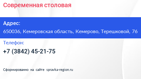 Современная столовая по адресу 650036, Кемеровская область, Кемерово, Терешковой, 76 в дальнейшем Организация, размещена в следующих категориях: