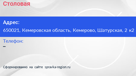 Столовая по адресу 650021, Кемеровская область, Кемерово, Шатурская, 2 к2 в дальнейшем Организация, размещена в следующих категориях: