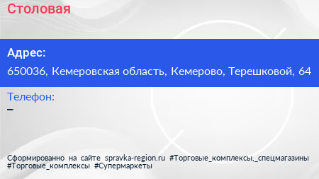 Столовая по адресу 650036, Кемеровская область, Кемерово, Терешковой, 64 в дальнейшем Организация, размещена в следующих категориях: