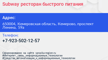 Subway, ресторан быстрого питания по адресу 650004, Кемеровская область, Кемерово, проспект Ленина, 59а в дальнейшем Организация, размещена в следующих категориях: