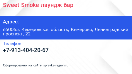 Sweet Smoke, лаундж-бар по адресу 650065, Кемеровская область, Кемерово, Ленинградский проспект, 22 в дальнейшем Организация, размещена в следующих категориях:
