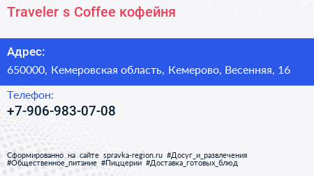Traveler`s Coffee, кофейня по адресу 650000, Кемеровская область, Кемерово, Весенняя, 16 в дальнейшем Организация, размещена в следующих категориях: