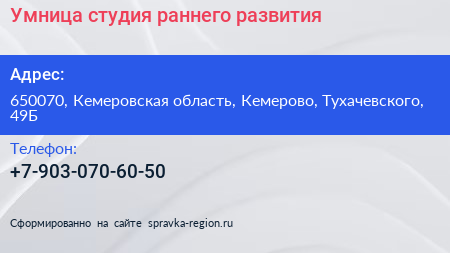 Умница, студия раннего развития по адресу 650070, Кемеровская область, Кемерово, Тухачевского, 49Б в дальнейшем Организация, размещена в следующих категориях:
