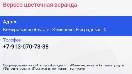 Веросо, цветочная веранда по адресу Кемеровская область, Кемерово, Ноградская, 5 в дальнейшем Организация, размещена в следующих категориях: