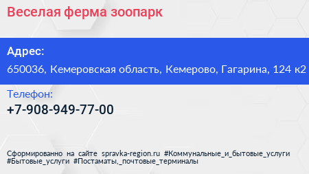 Веселая ферма, зоопарк по адресу 650036, Кемеровская область, Кемерово, Гагарина, 124 к2 в дальнейшем Организация, размещена в следующих категориях: