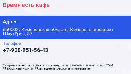 Время есть!, кафе по адресу 650002, Кемеровская область, Кемерово, проспект Шахтёров, 87 в дальнейшем Организация, размещена в следующих категориях: