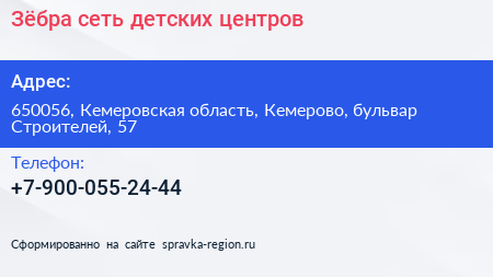 Зёбра, сеть детских центров по адресу 650056, Кемеровская область, Кемерово, бульвар Строителей, 57 в дальнейшем Организация, размещена в следующих категориях: