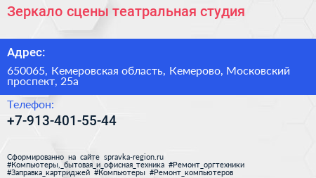 Зеркало сцены, театральная студия по адресу 650065, Кемеровская область, Кемерово, Московский проспект, 25а в дальнейшем Организация, размещена в следующих категориях: