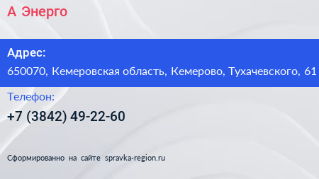 А-Энерго по адресу 650070, Кемеровская область, Кемерово, Тухачевского, 61 в дальнейшем Организация, размещена в следующих категориях: