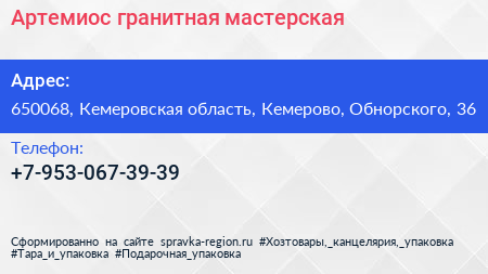 Артемиос, гранитная мастерская по адресу 650068, Кемеровская область, Кемерово, Обнорского, 36 в дальнейшем Организация, размещена в следующих категориях: