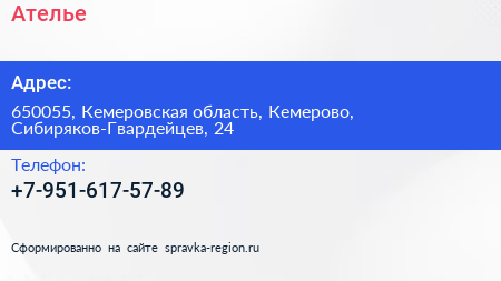 Ателье по адресу 650055, Кемеровская область, Кемерово, Сибиряков-Гвардейцев, 24 в дальнейшем Организация, размещена в следующих категориях: