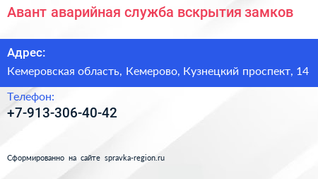 Авант, аварийная служба вскрытия замков по адресу Кемеровская область, Кемерово, Кузнецкий проспект, 14 в дальнейшем Организация, размещена в следующих категориях: