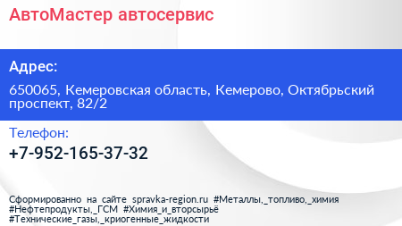 АвтоМастер, автосервис по адресу 650065, Кемеровская область, Кемерово, Октябрьский проспект, 82/2 в дальнейшем Организация, размещена в следующих категориях: