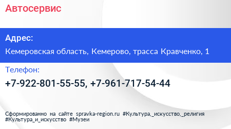 Автосервис по адресу Кемеровская область, Кемерово, трасса Кравченко, 1 в дальнейшем Организация, размещена в следующих категориях: